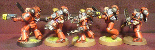 Thanks to the new camera you can see I've some way to go. They should come to about the same shade of red when I'm done hightlighting. I'll be looking to field 2 10-man squads of jump marines (with 2 meltaguns and a powerfist, of course). Just assembled 5 today, out of my bits box, together with a converted Sternguard Veteran with heavy flamer and one more Sanguinary Priest.